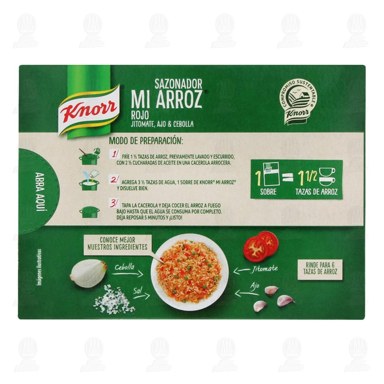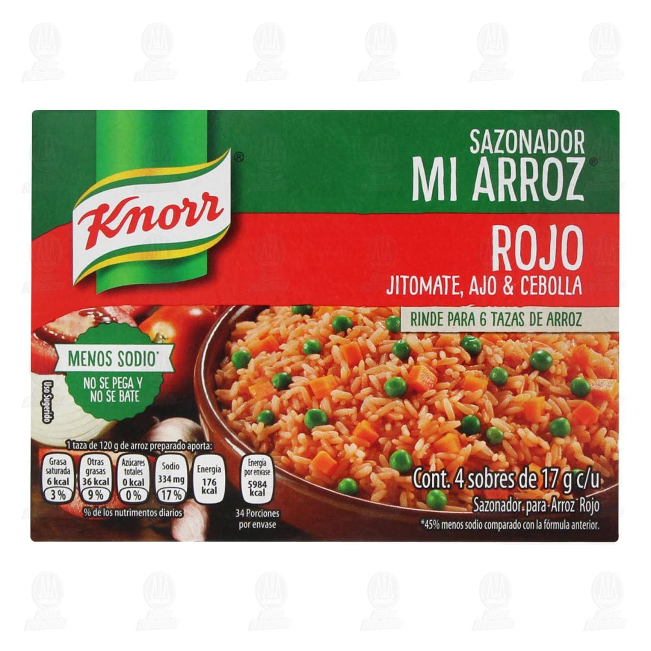 Sazonador Mi Arroz Knorr para arroz rojo sabor jitomate, ajo & cebolla. Caja de 68 gramos con 4 sobres de 17 gramos cada uno.