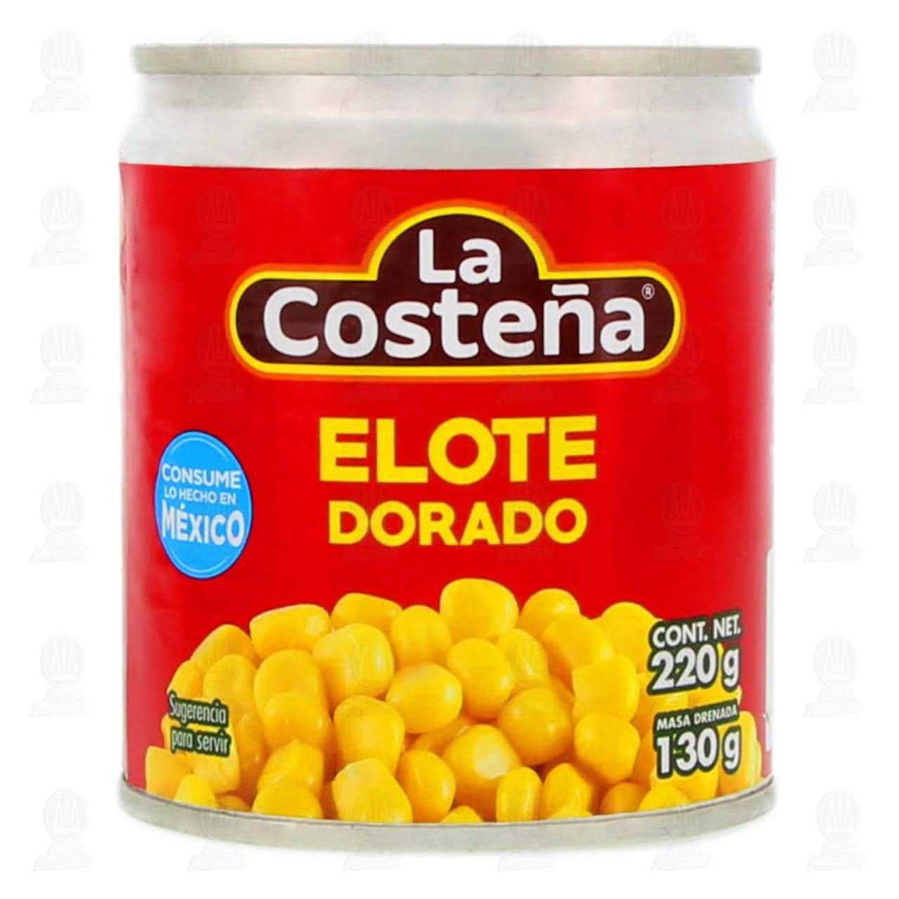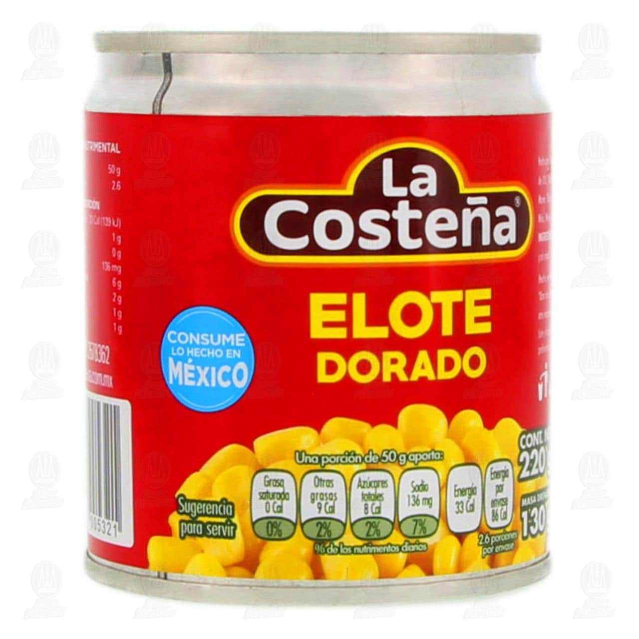 Alimento enlatado La Costeña, elote dorado sin conservadores. Lata con 220 gramos, masa drenada 130 gramos.
