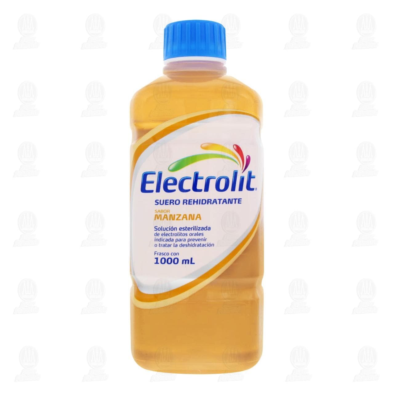 Suero rehidratate Electrolit para prevenir o tratar la deshidratación ocasionada por el exceso de calor, desgaste físico intenso, insolación, resaca, vómito y/o diarrea, sabor manzana. Envase con 1000 mililitros.