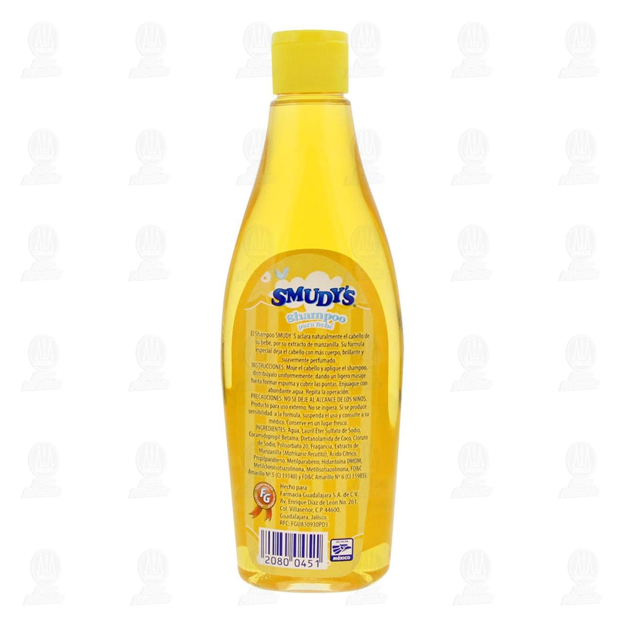 Shampoo para bebé Smudy's con manzanilla, para un cabello suave y limpio. Envase con 250 mililitros.