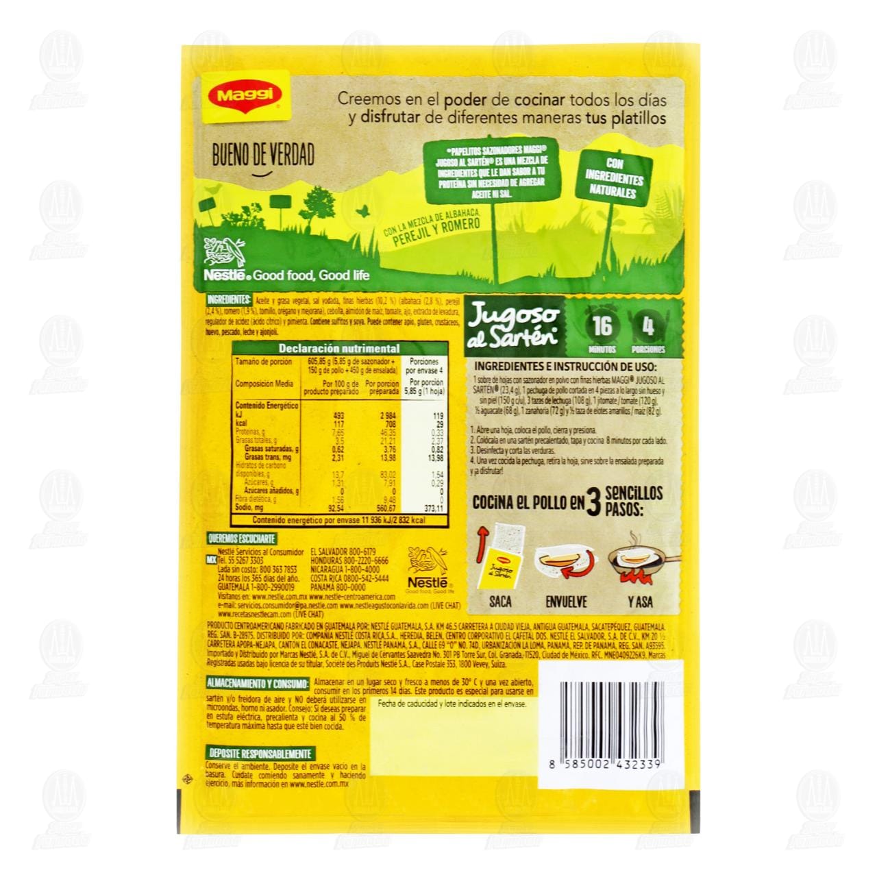 Papelitos Sazonadores Maggi Jugoso al Sartén con mezcla de albahaca, perejil y romero, cocción sin aceite ni sal, ideal para pollo, pescado, carne o vegetales. Contiene 1 sobre con 4 hojas.