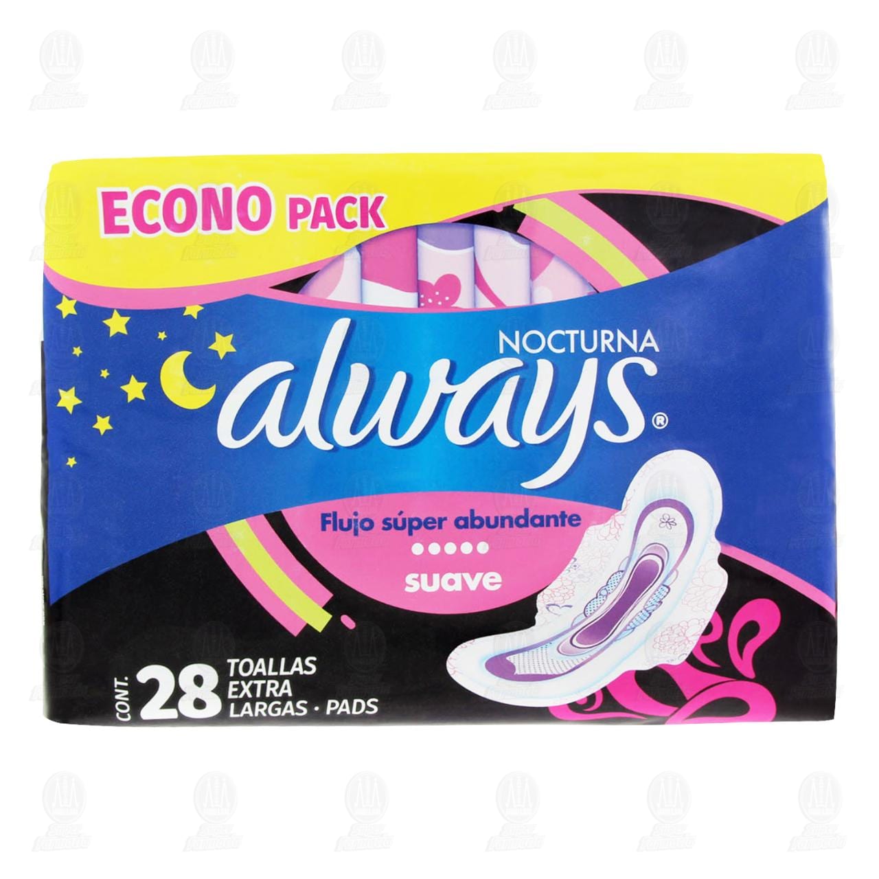 Toallas higiénicas Always Nocturna Suave, extras largas, para flujo super abundante. Paquete con 28 piezas.