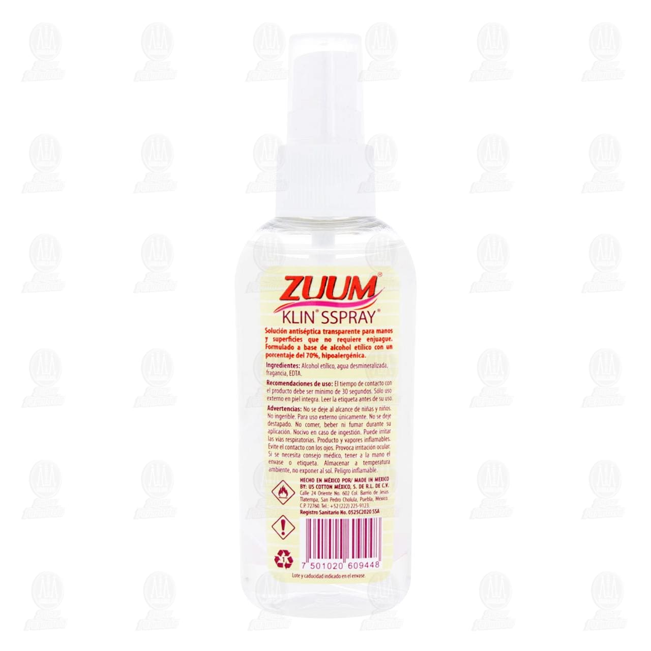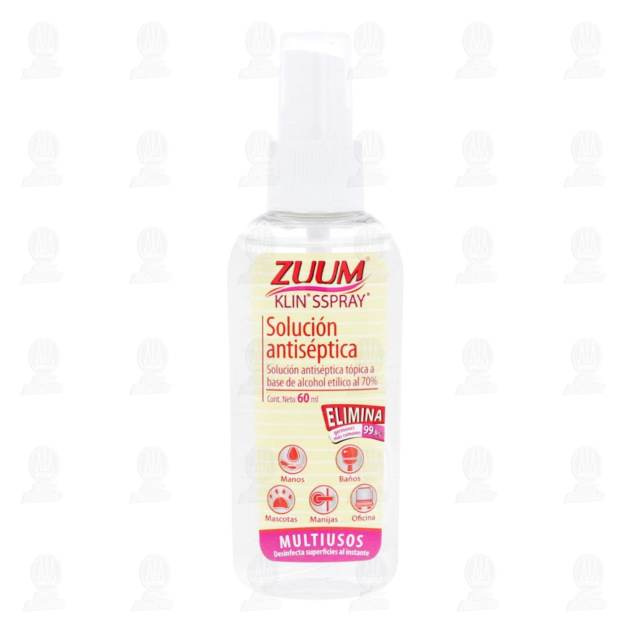 Solución antiséptica tópica Zuum Klin Sspray Multiusos para manos y superficies que no requiere enjuague, formulado a base de alcohol etílico al 70%, desinfecta superficies al instante. Envase con 60 mililitros.