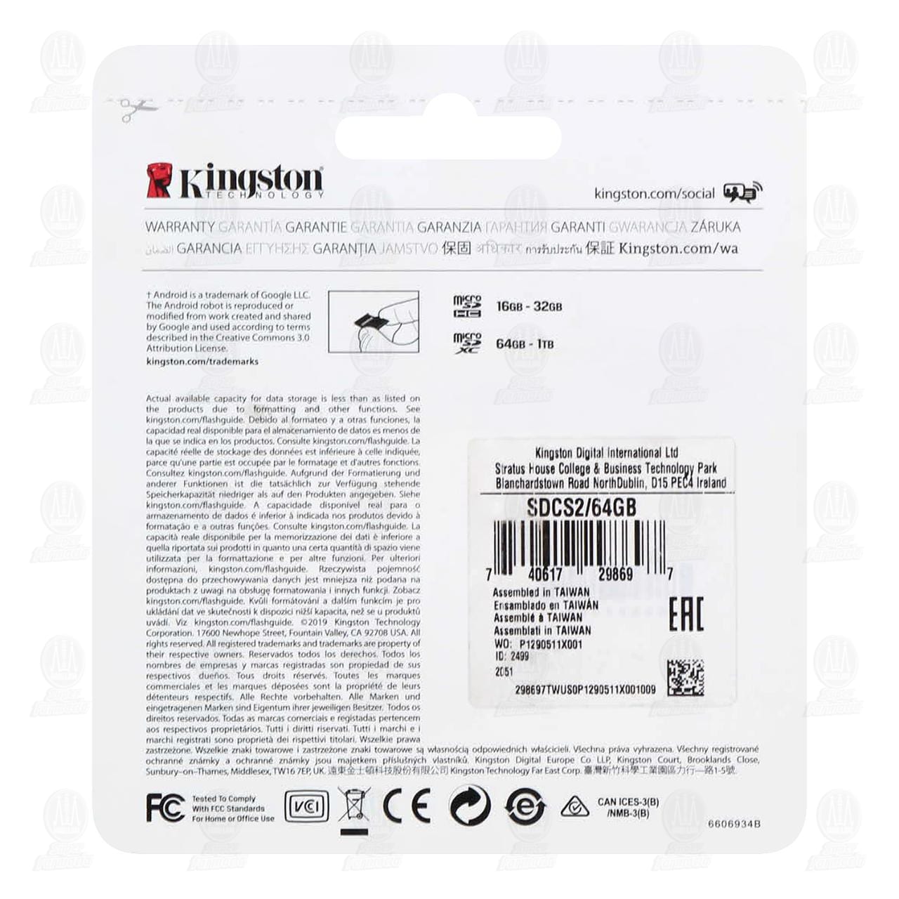 Tarjeta de memoria Kingston Canvas Select Plus microSD XC de 64 gigabytes, clase 10, UHS-I, U1, A1, con adaptador a SD. Contiene 2 piezas (1 tarjeta de 64GB + 1 adaptador).