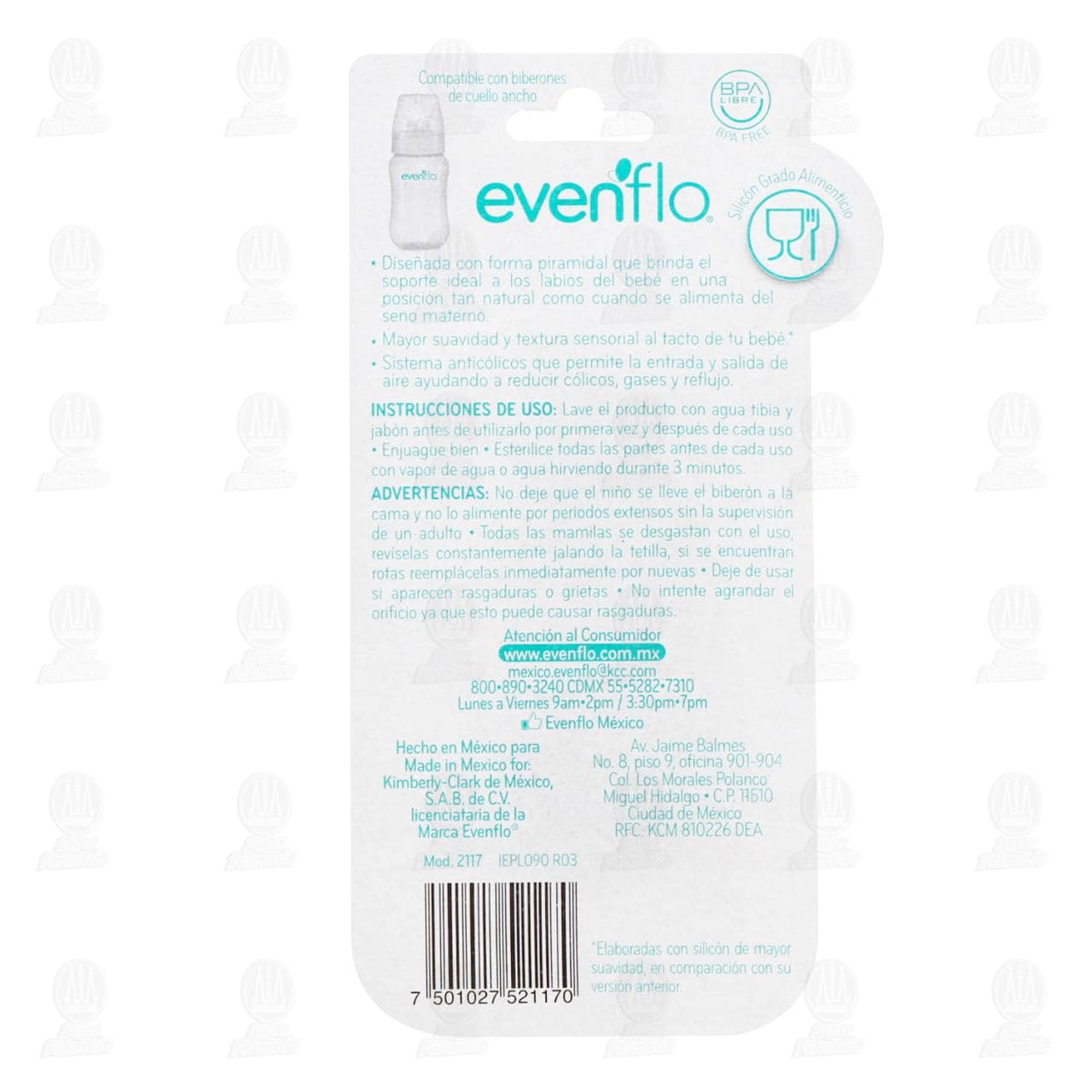 Mamilas de silicón Evenflo de flujo rápido para bebes de 6 meses en adelante, diseñadas con forma piramidal que brinda el soporte ideal a los labios del bebé, mayor suavidad y textura sensorial. Contiene 2 piezas.