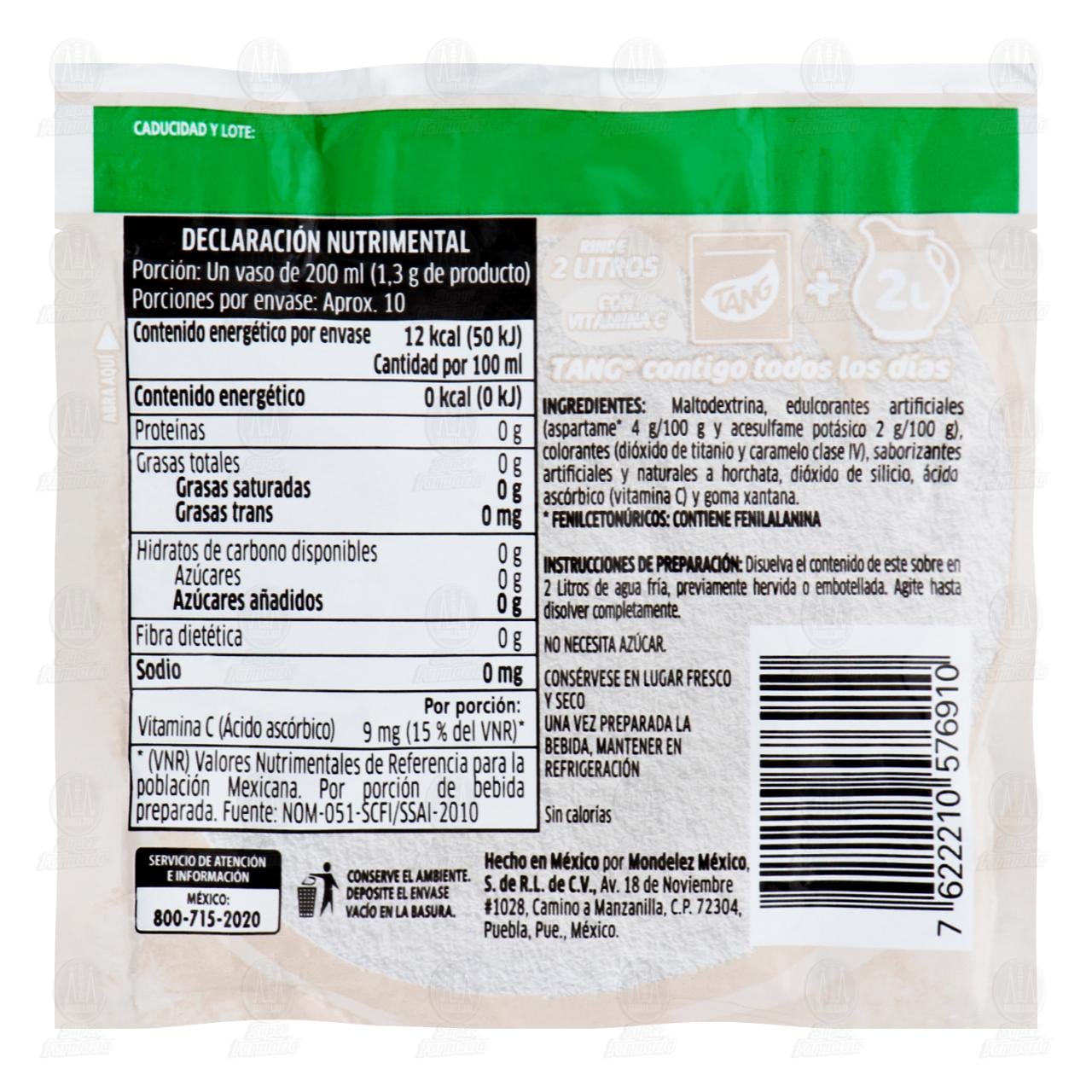 Polvo para preparar Bebida Tang sin azúcares sabor a horchata, Adicionado con vitamina C. Sobre con 13 gramos.