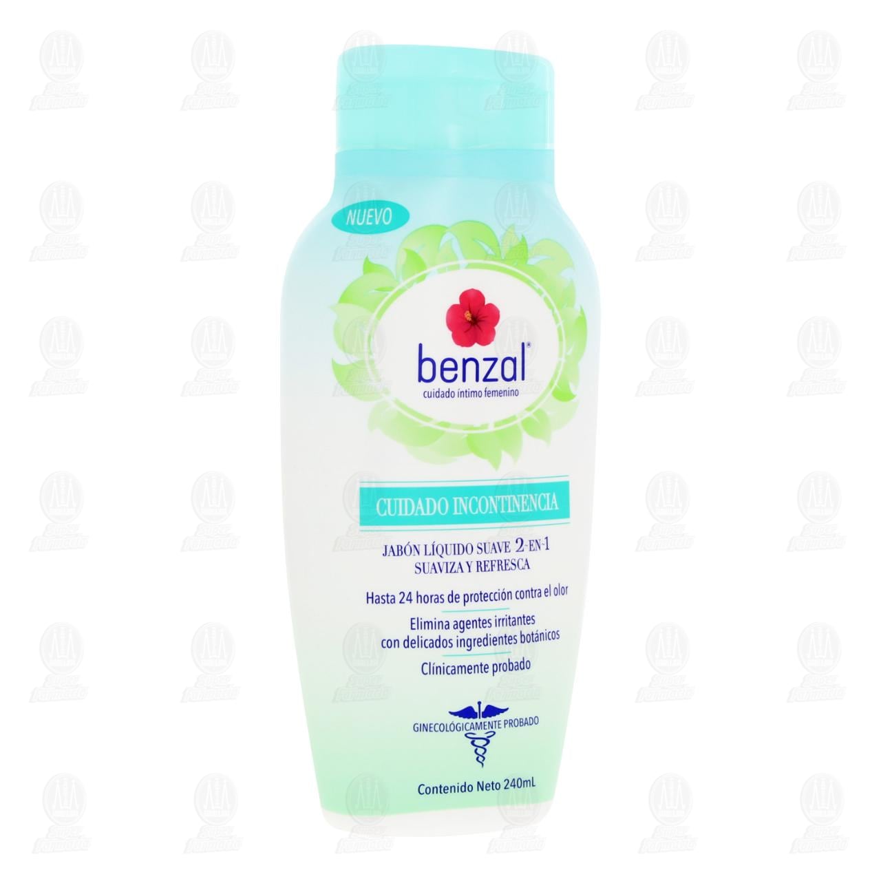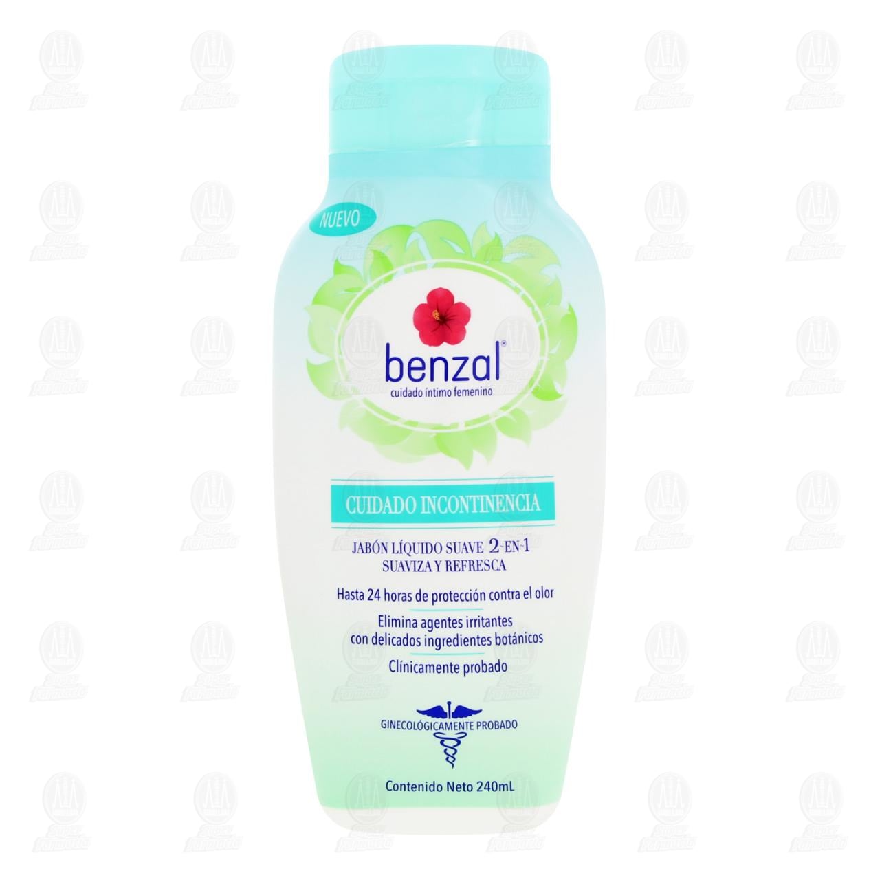 Jabón Líquido Suave Benzal Cuidado Incontinencia 2-en-1 Suaviza y Refresca, Especialmente diseñado para que el olor sea indetectable y calmar la piel irritada, de uso diario. Envase con 240 mililitros.