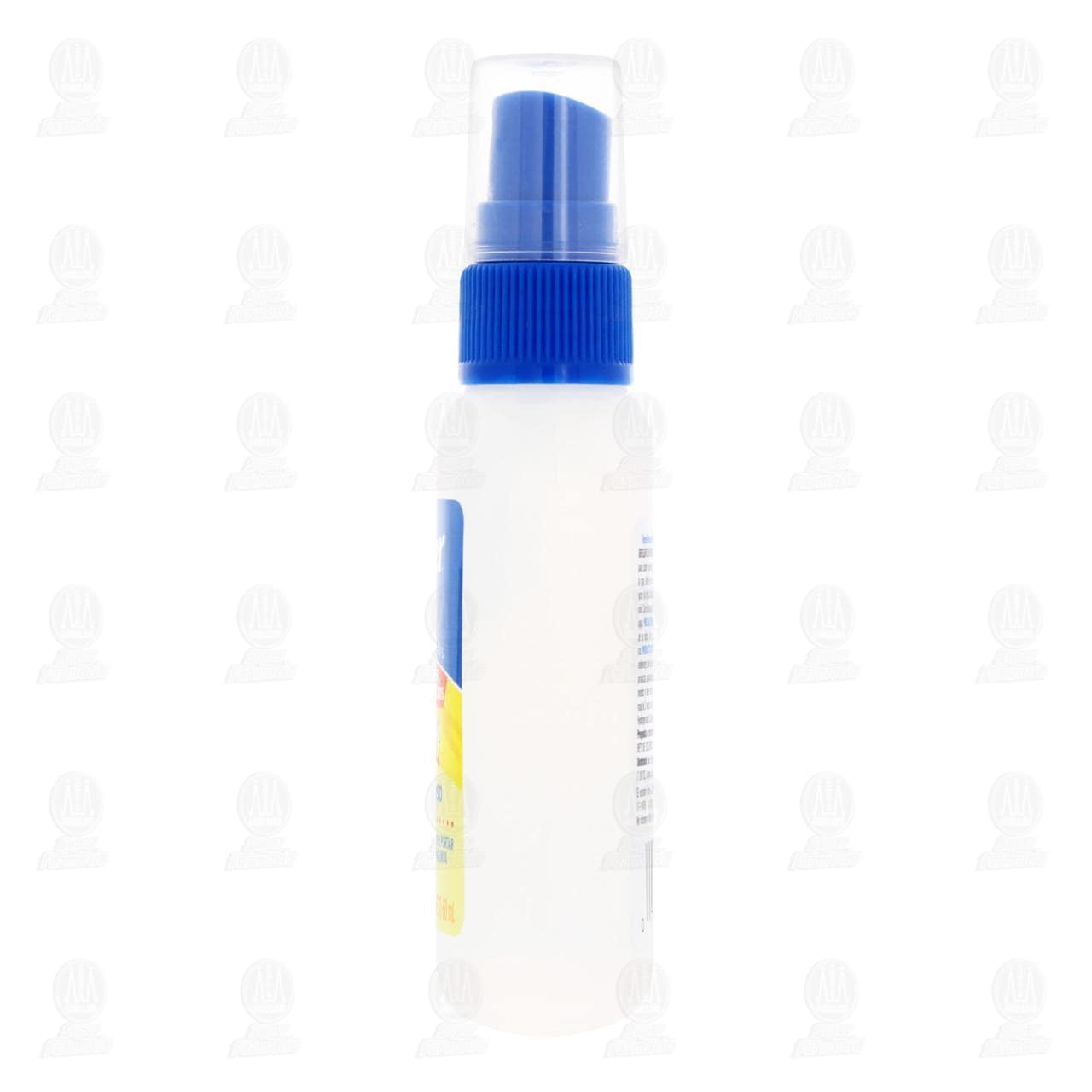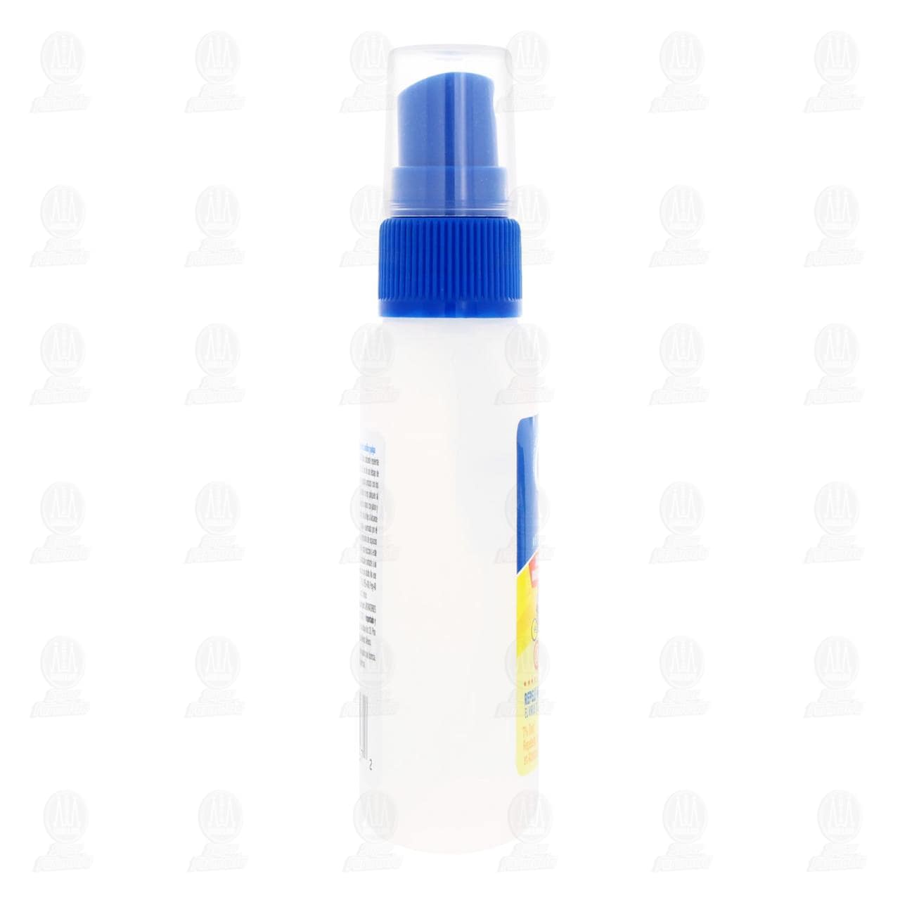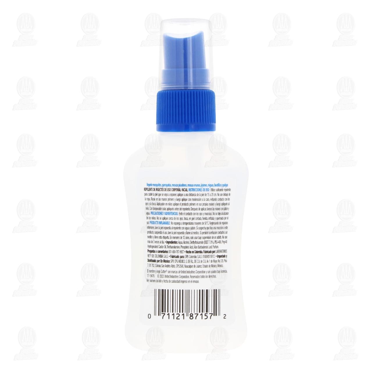 No use debajo de la ropa. No rocíe directamente en la cara. Rocíe en las manos primero y luego aplique con moderación a la cara, evitando contacto con los ojos. No aplique cerca de ojos y boca. Aplique ligeramente alrededor de las orejas. No aplique en las manos de los niños. No permita que los niños manejen este producto. Cuando lo utilice en niños aplique el producto primero en sus propias manos y luego aplíquelo al niño. Evite la aplicación excesiva de este producto. Después de aplicar este producto lávese las manos con jabón y agua. Precauciones: Lea y siga las indicaciones y precauciones de este producto. Evite el contacto con los ojos y mucosas. No se deje al alcance de los niños. No se aplique cerca de los ojos, boca, en piel cortada, o irritada. No aplique sobre piel quemada por el sol. No daña el nylon, algodón o lana. Puede dañar algunos tejidos sintéticos; plásticos, cristales de reloj o gafas, cuero o superficies pintadas o barnizadas. No quemar ni perforar el envase, aun después de vacío. No utilice este envase después de terminado el producto. Lleno o vacío no acerque ni aplique el producto cerca del fuego o instalaciones eléctricas. No exponga el producto al calor. No tire el producto al drenaje. No exponga a temperaturas mayores a 50°C. Cuando regrese de espacios exteriores, lave la piel expuesta al repelente con aguay jabón. Lave la ropa tratada con repelente antes de vestirla. No contamine fuentes de agua. Si sospecha que hay una reacción a este producto, suspenda el uso, lave la piel expuesta y llame al médico. Si acude al médico, lleve este producto consigo o su etiqueta. Para menores de 12 años, solo usar bajo supervisión de un adulto. No se use más de 3 veces al día.