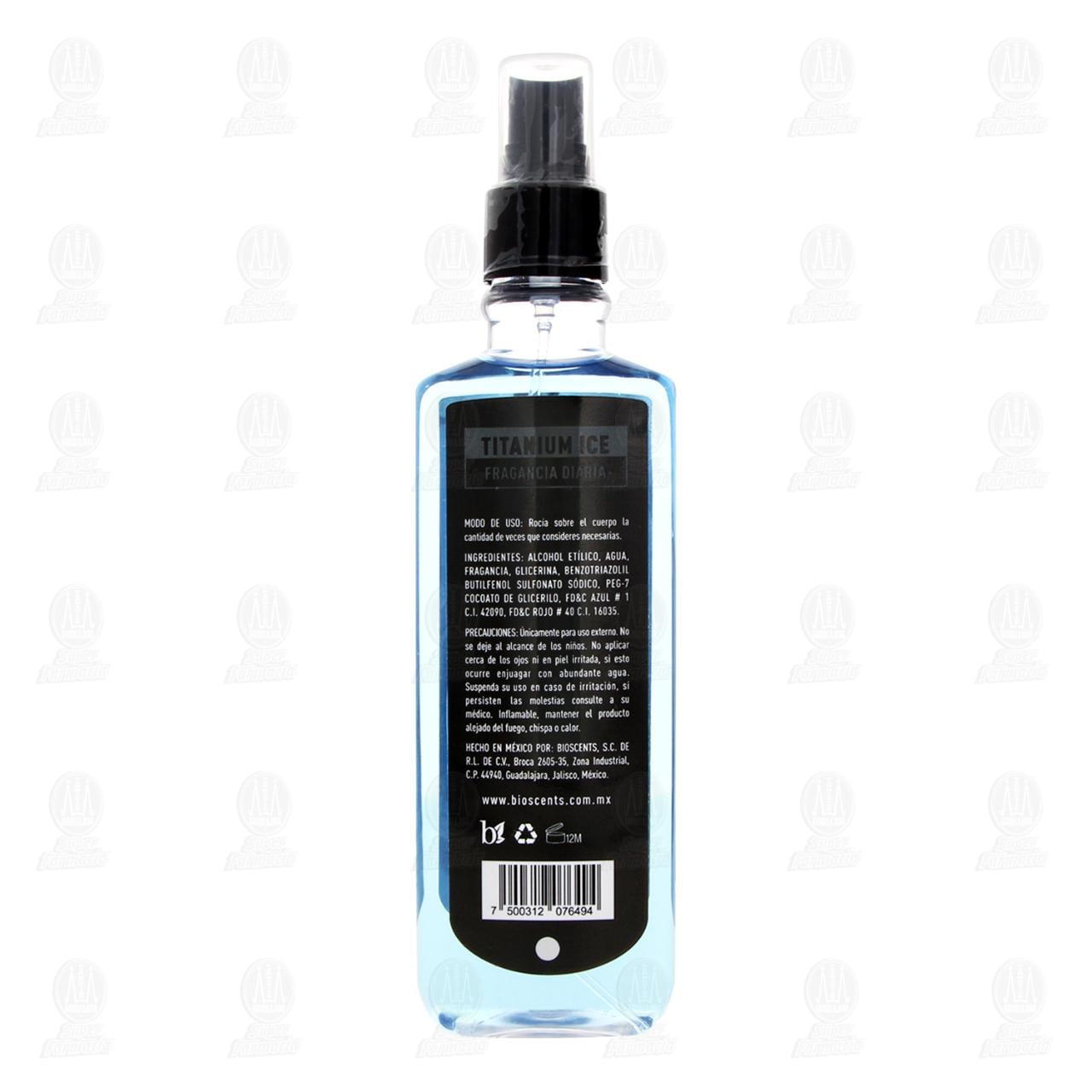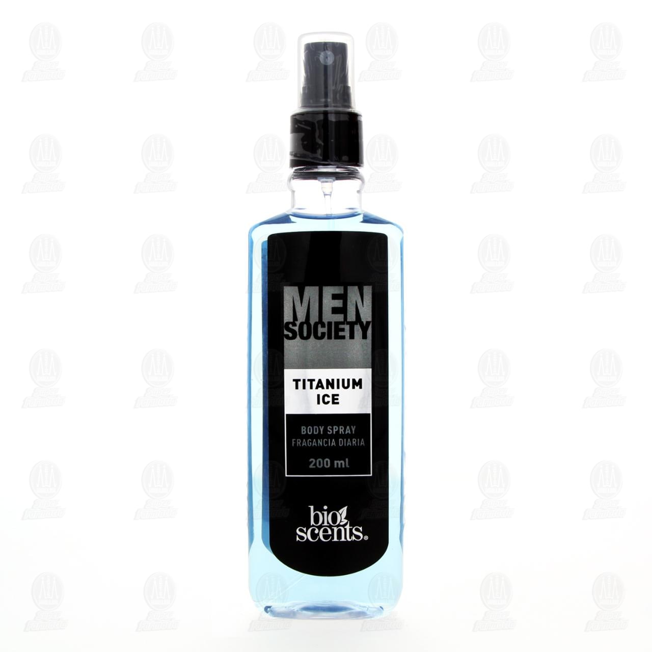 Fragancia Diaria Men Society Titanium Ice Body Spray. Envase con 200 mililitros.