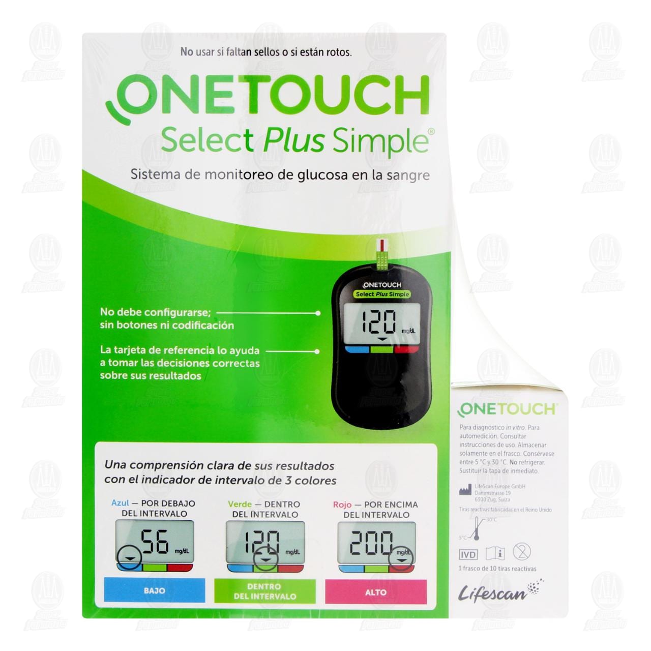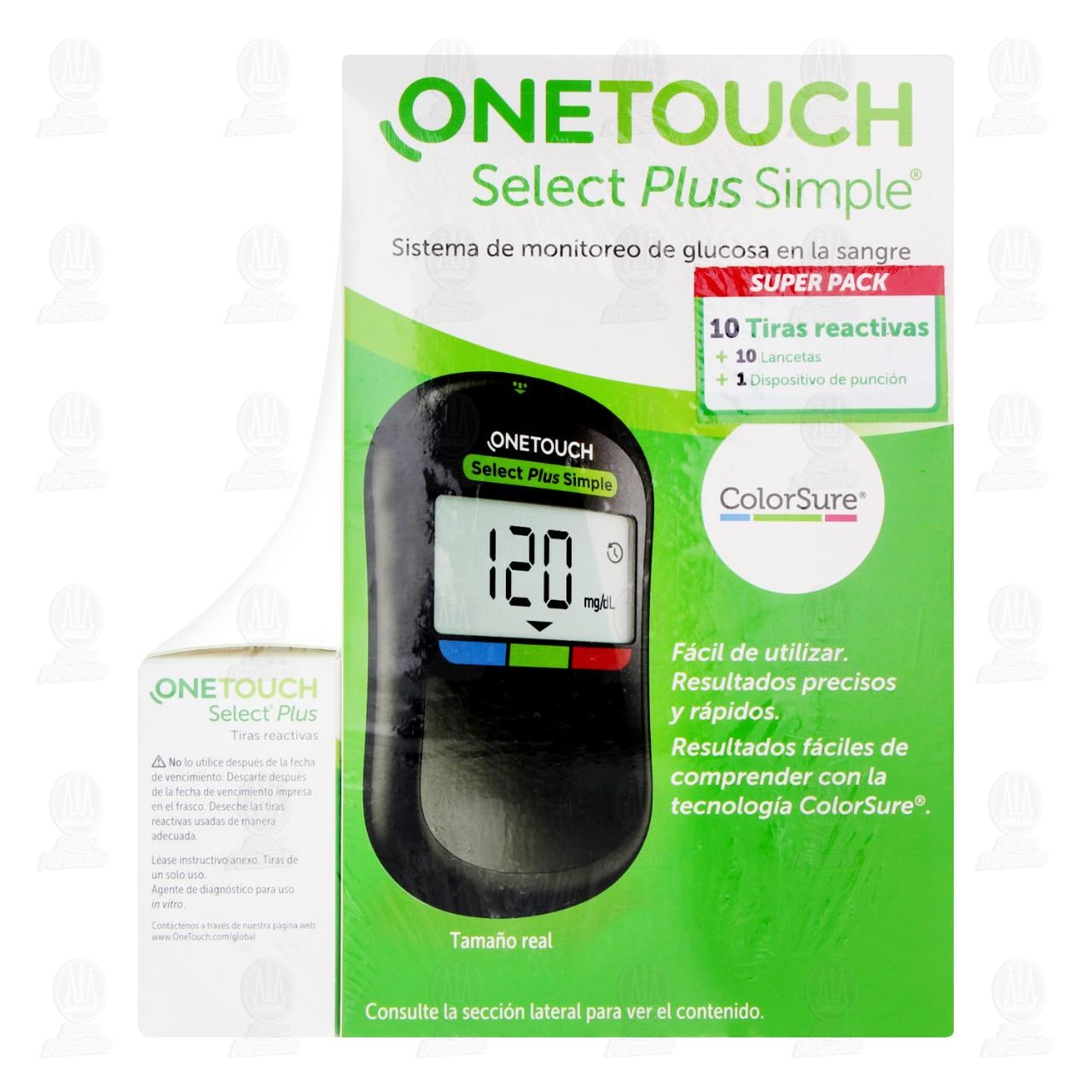Pack One Touch Select Plus Simple. Contiene 3 piezas: 1 one touch select plus con 10 tiras reactivas, 1 one touch select plus simple sistema de monitoreo de glucosa en la sangre y 10 lancetas.