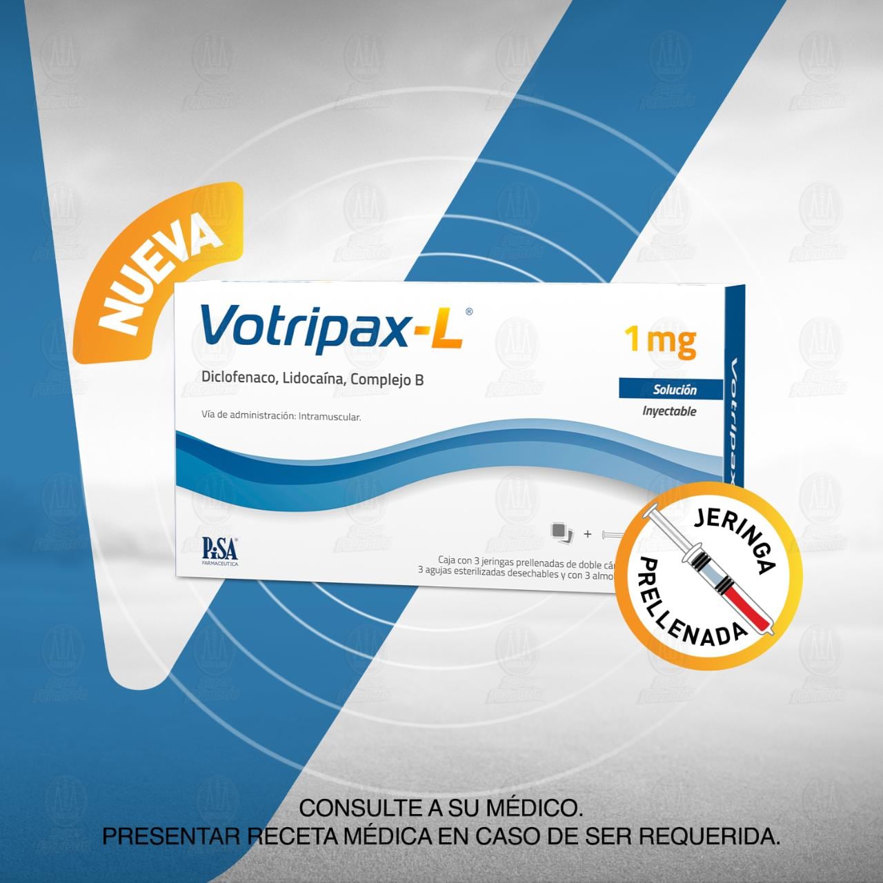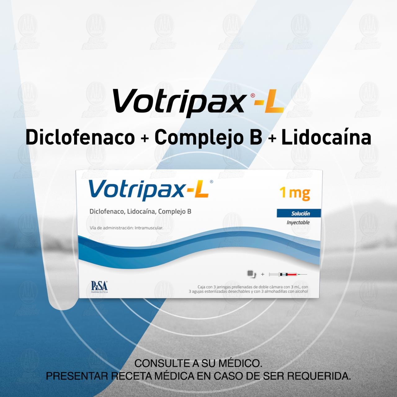 Votripax-L 1 miligramo Solución Inyectable, 3 jeringas prellenadas de doble cámara con 3 mililitros con 3 agujas esterilizadas desechables y con 3 almohadillas con alcohol (Diclofenaco, Lidocaína, Complejo B)