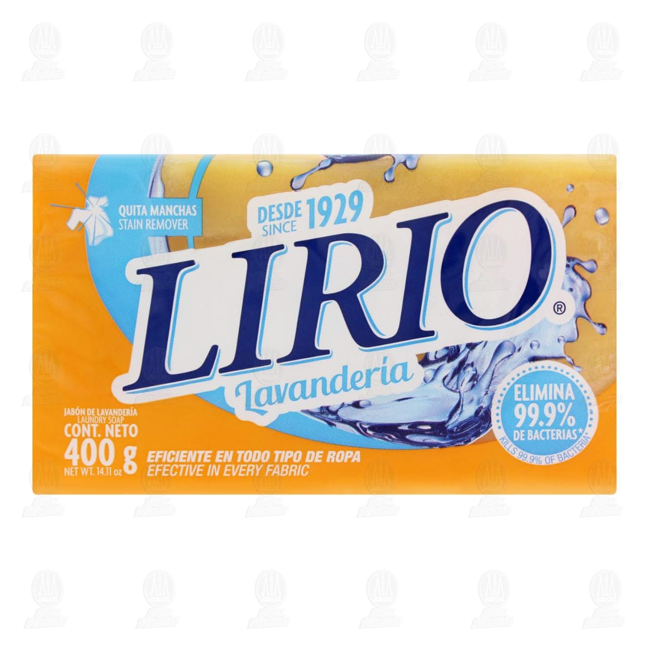 Jabón de lavandería Lirio, eficiente para todo tipo de ropa, quita manchas, elimina 99.9% de bacterias. Contiene 400 gramos.