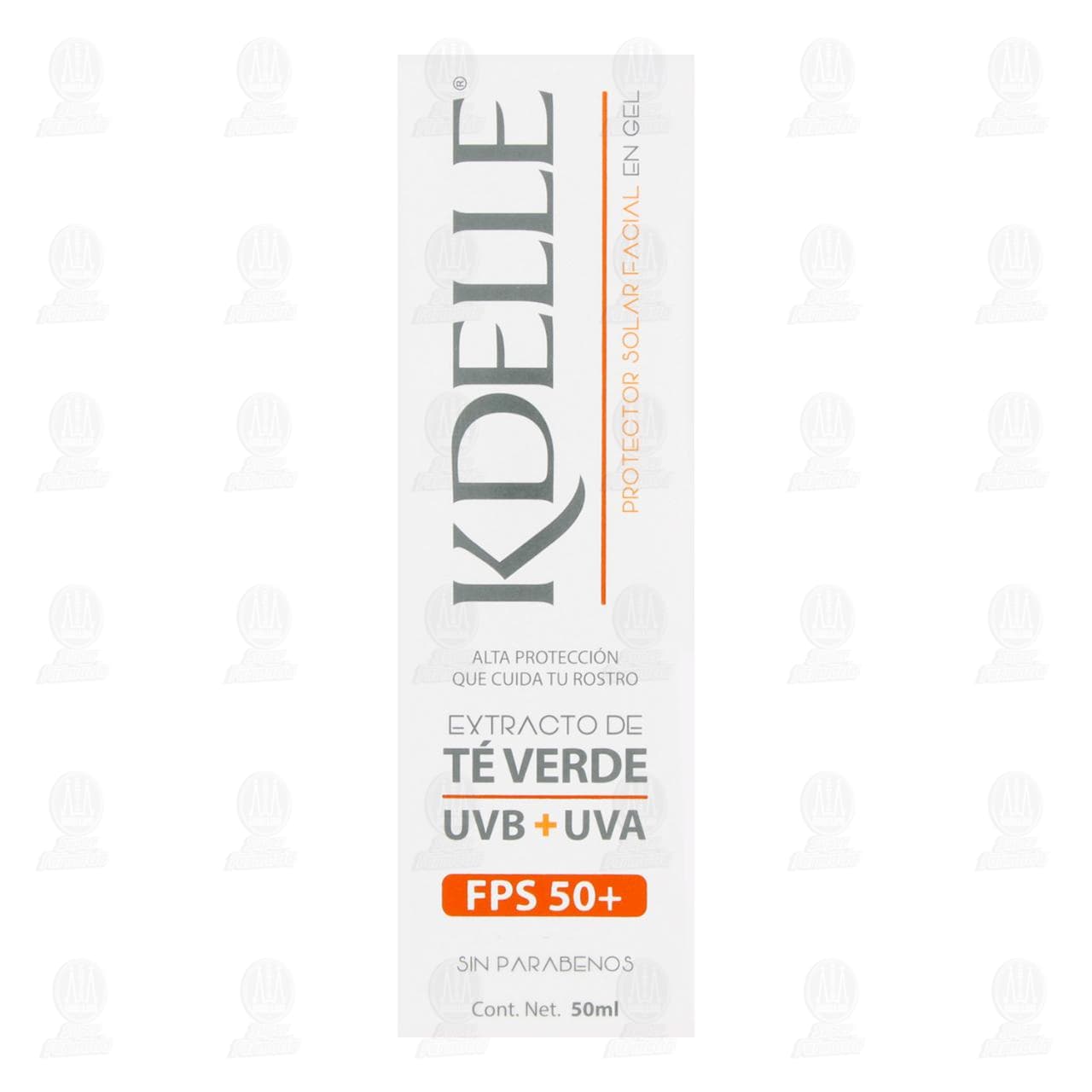 Protector solar facial Kdelle en gel, con extracto de té verde, alta protección UVB + UVA FPS 50+ que cuida tu rostro. Contiene 50 mililitros.