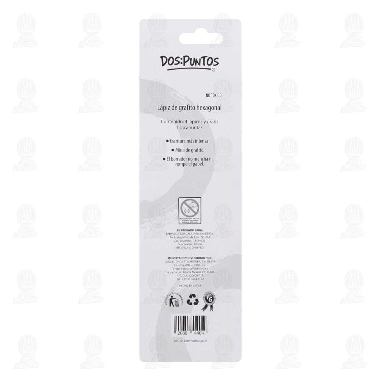Lápiz de grafito Dos:Puntos hexagonal con borrador. Contiene 5 piezas (4 lápices + 1 sacapuntas gratis).