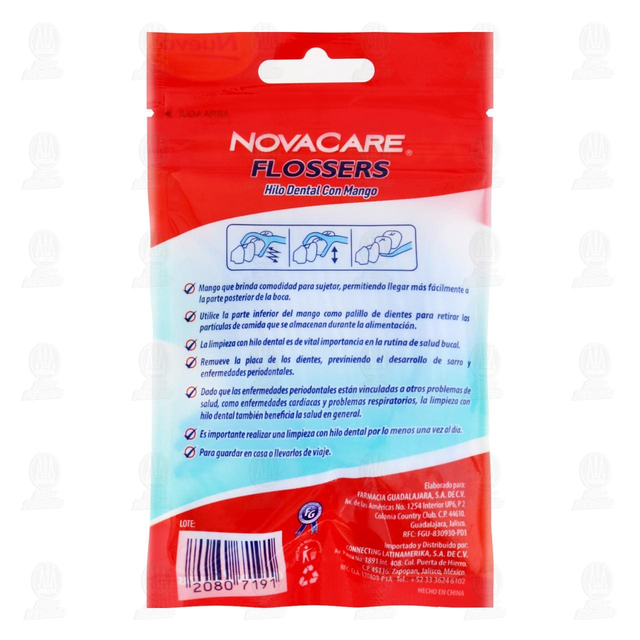 Hilo Dental Novacare Flossers con Mango, con hilo encerado de PTFE y cera microcristalina. No se deshebra, muy resistente para un mejor deslizamiento. Contiene 25 piezas.