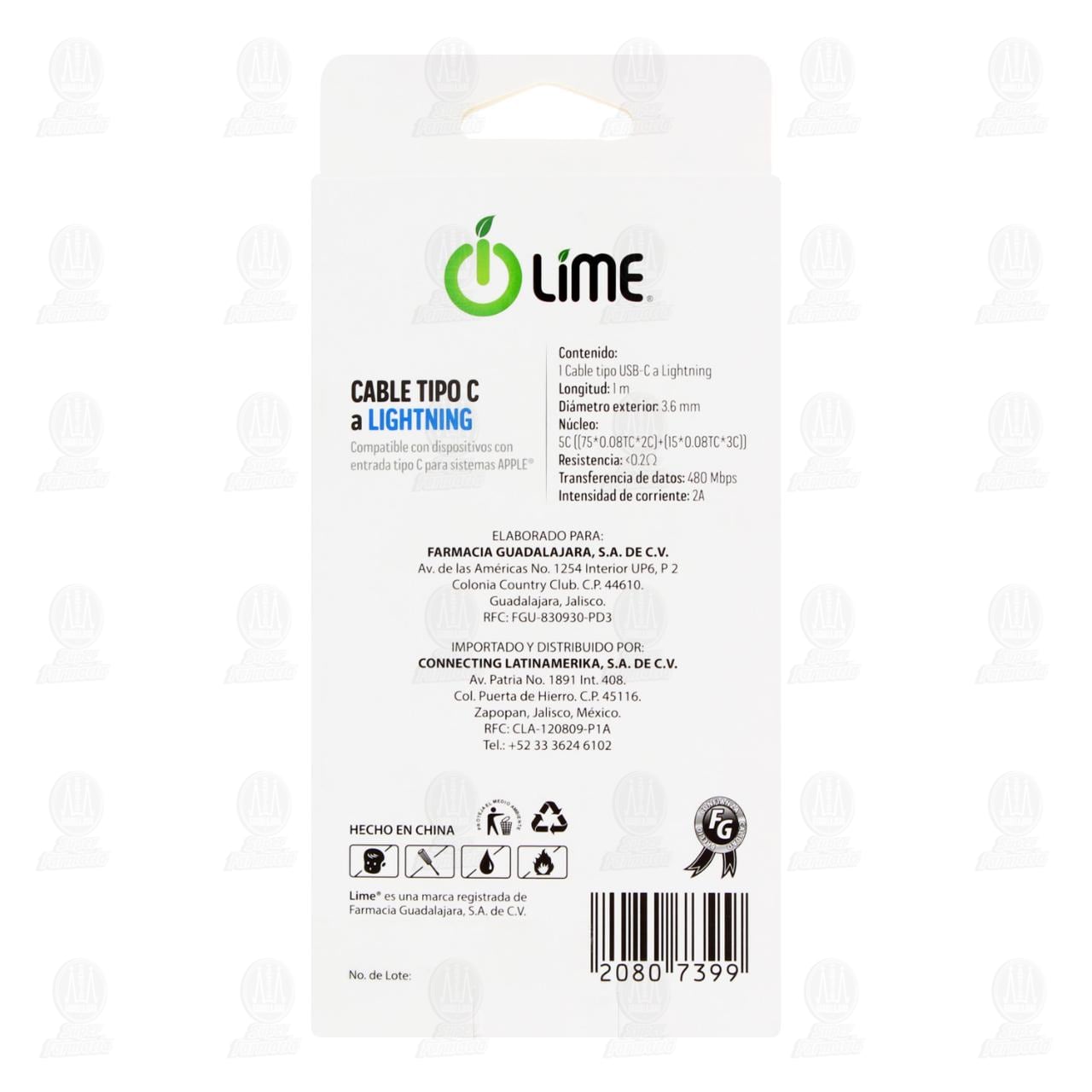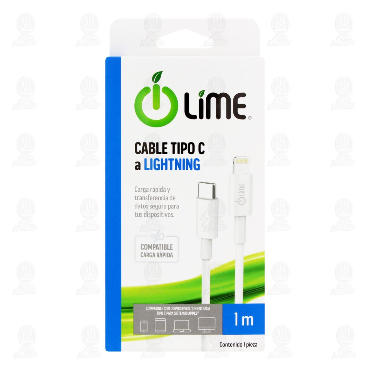 Cable Lime USB Tipo C a Lightning de 1 metro para sistemas Apple, Carga rápida y transferencia de datos segura para tus dispositivos. Contiene 1 pieza.