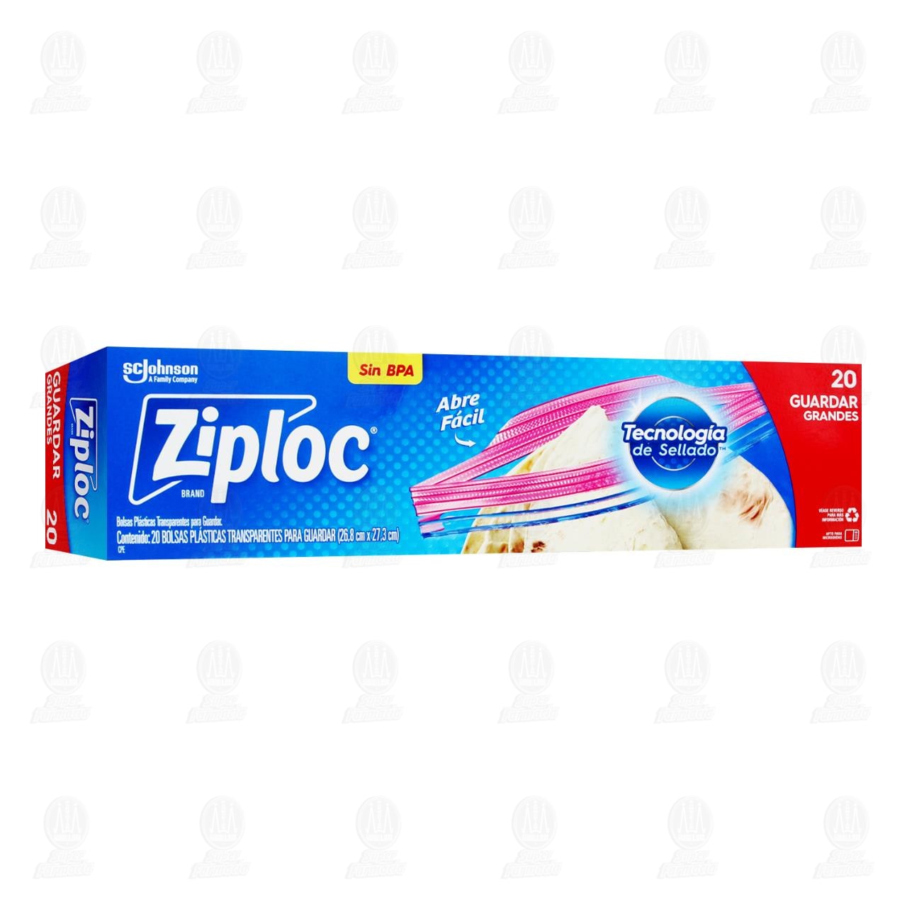 Bolsas Ziploc Grandes de Plastico Transparentes para guardar, con tecnología de sellado hermético que ayuda a conservar la frescura de tus alimentos. Contiene 20 bolsas de 26.8 x 27.3 centímetros.